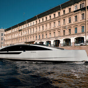 Моторная яхта «Ялта» продумана до мелочей. Выделено 3 зоны — крытый салон с панорамным остеклением, уборной и обеденной зоной, мягкая зона на носу и корма с диванами и деревянным столом.
