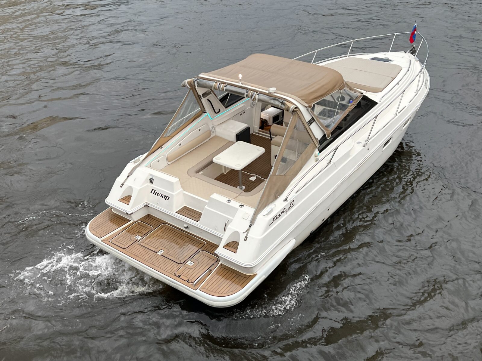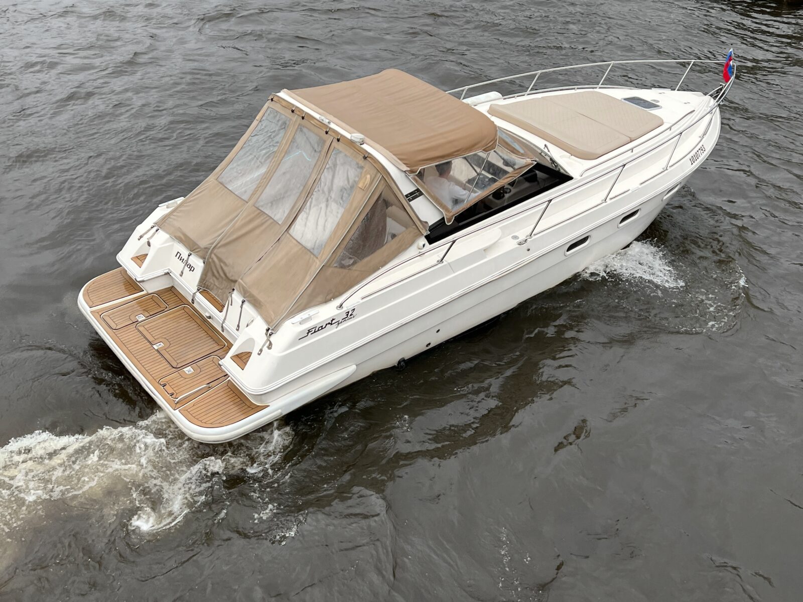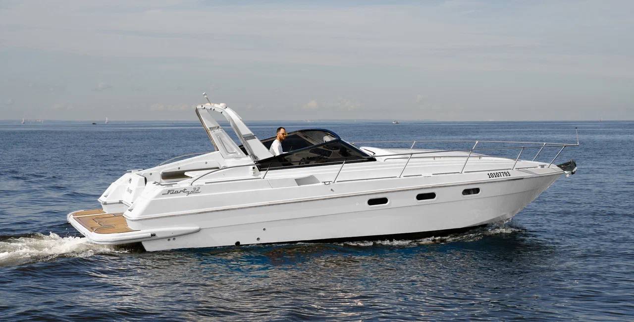 Если вам нужен катер на большую компанию, то Fiart 32 идеальный вариант. Это комфортабельный круизер с удобным П-образным диваном и выдвижным столом на компанию до 10 гостей. На борту есть теплые пледы, аудиосистема с Bluetooth, тент на случай непогоды, холодильник, туалет, а также большая закрытая каюта. Такой катер подойдет как для обзорных прогулок по рекам и каналам, свадебных фотосессий, вечеринок, так и для дальних путешествий, например, в Петергоф, Кронштадт или на Крепость «Орешек».