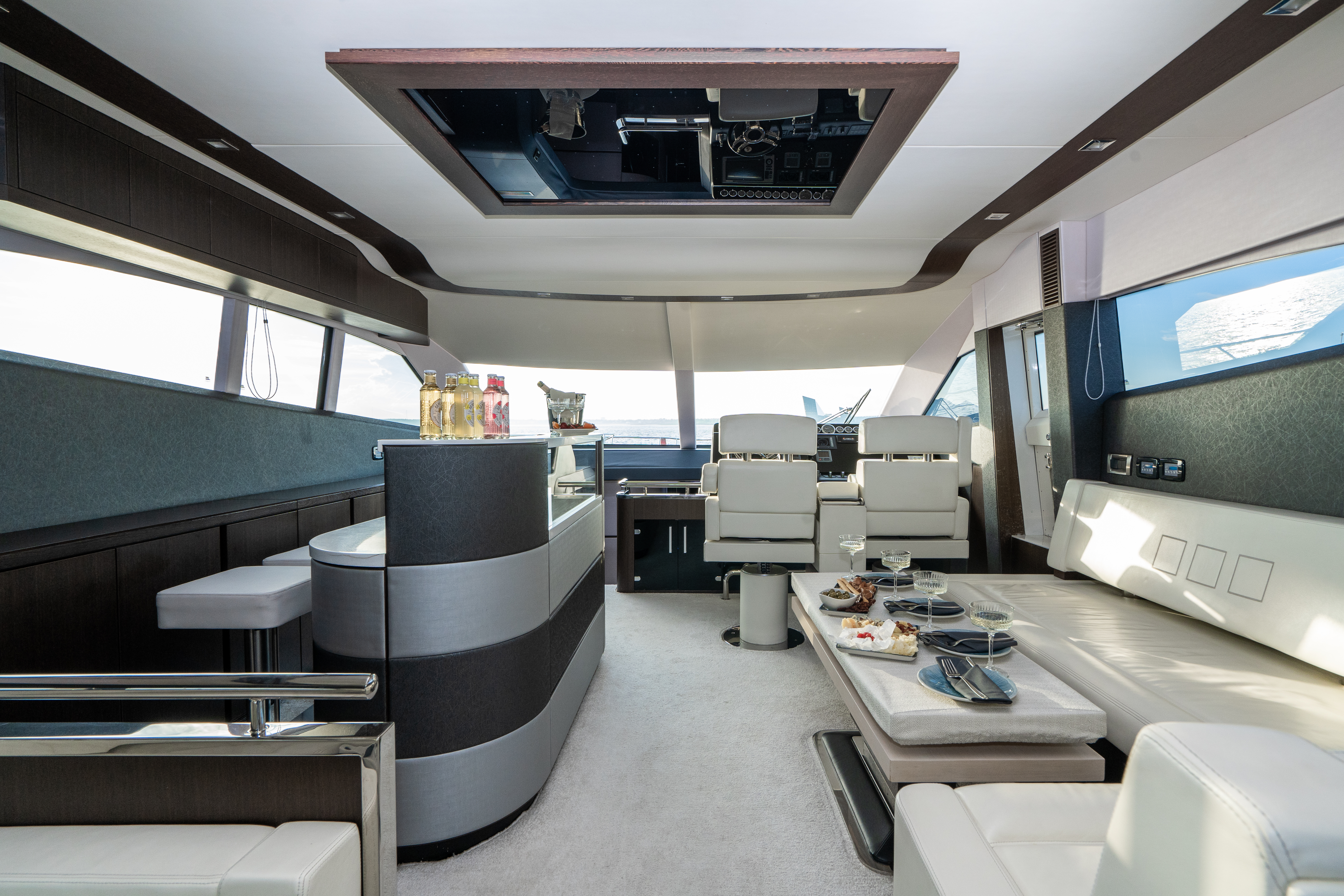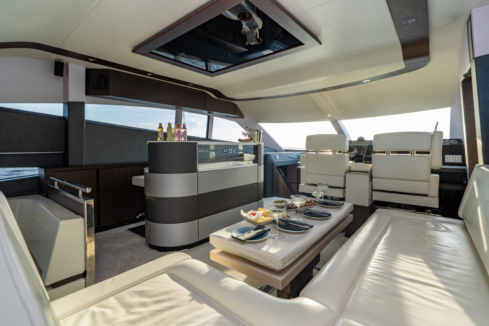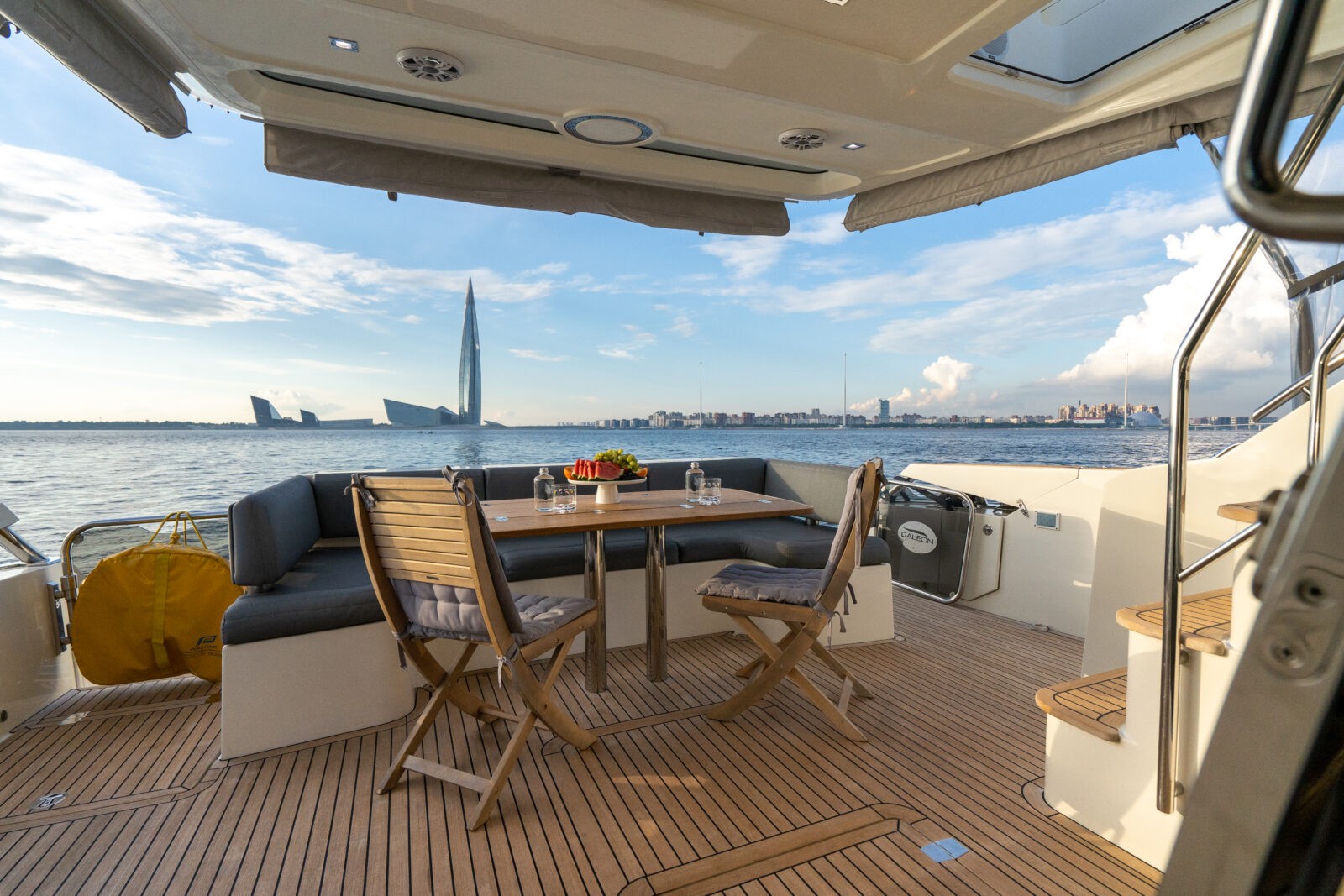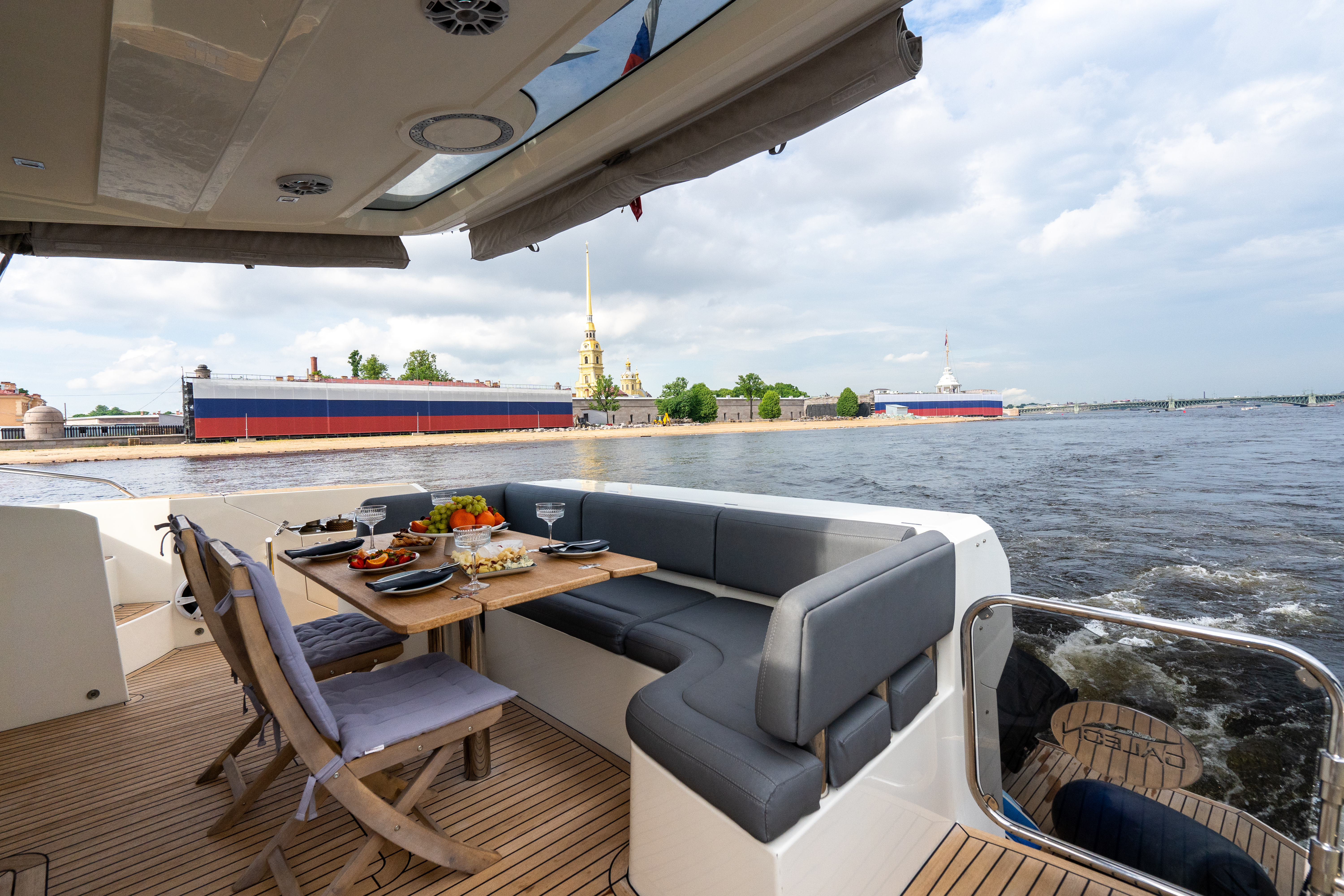 Две палубы с панорамными окнами, изысканная отделка из белоснежной кожи — все это создает атмосферу утонченности. Крытый салон, оснащенный мощной аудиосистемой и уютными диванами, станет идеальным местом для общения и отдыха. Барная зона и стол, где подаются чай, кофе и закуски, подойдут для дружеских встреч или переговоров с партнерами, а стильная подсветка и обогрев кают создают уют даже в прохладную погоду.